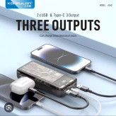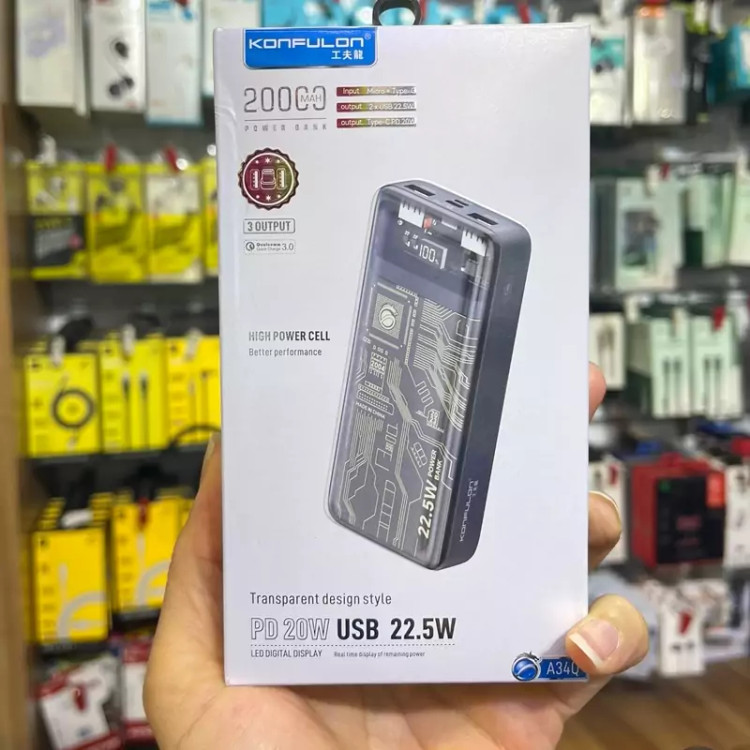 پاروبانک 20000 هزار میلی آمپر کانفلون با توان خروجی 22.5 وات سوپر شارژ و استاندارد PD می باشد این پاوربانک دارای دو ورودی میکرو و تایپ سی و سه خروجی که دوتای آنها usb فست شارژ و دیگری تایپ سی سوپر فست شارژ می باشد . گواهینامههاCE گواهینامههاUL نمایشگر دیجیتال مواد پوسته: پلاستیک رابط خروجی: دوگانه USB نمایشگر ال ای دی محافظت در مقابل ولتاژ بیش از حد مجاز حفاظت از اتصال کوتاه حفاظت چندگانه شناسه خودکار تجهیزات شارژ کانفلون Konfulon